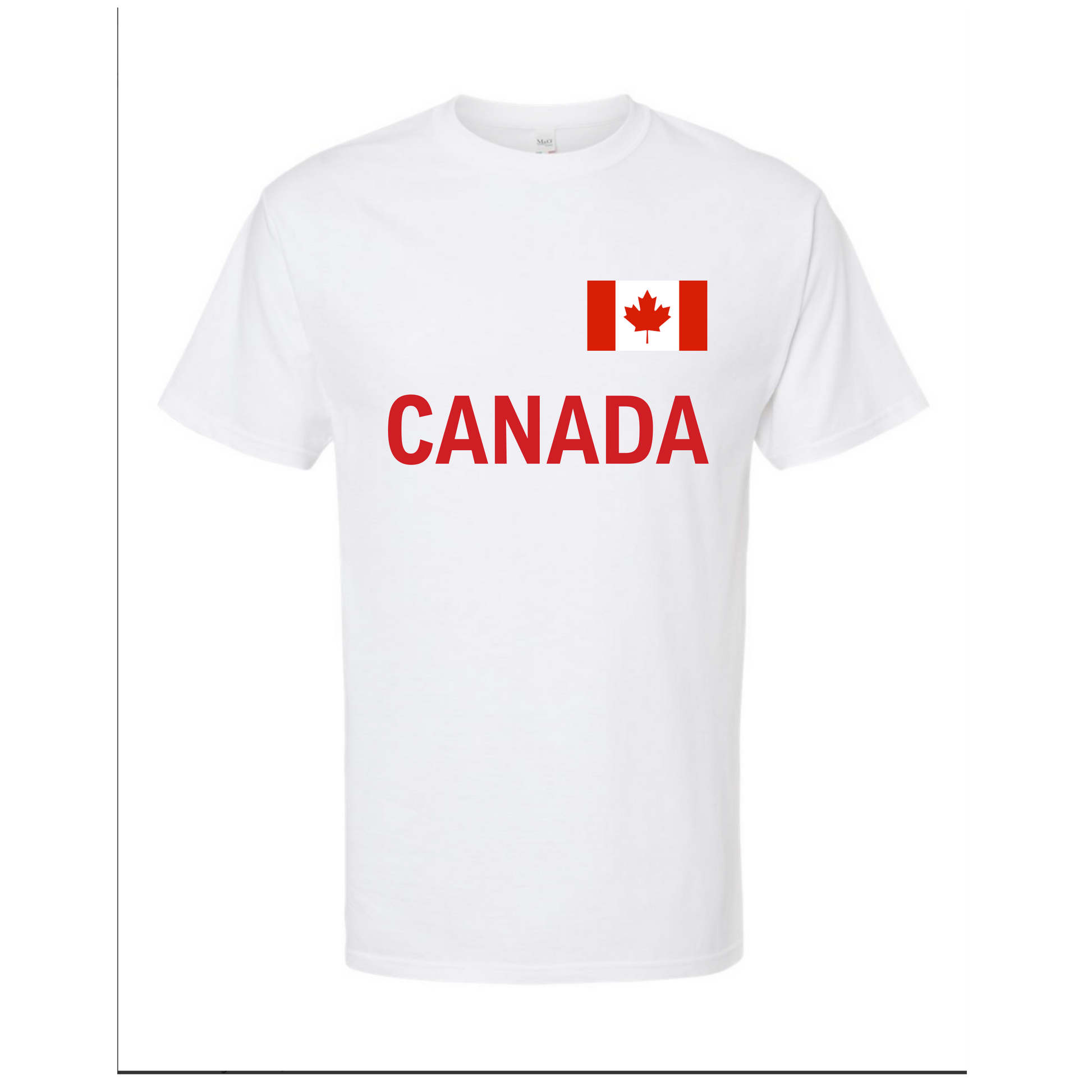 Show your Maple Leaf pride with this clean Canada fan tee. Featuring the country’s name boldly across the chest and the national flag on the left chest, this shirt celebrates Canada’s passion for football.